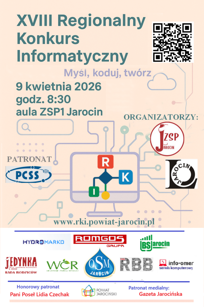 Organizatorzy Regionalnego Konkursu Informatycznego informują, że XVIII RKI odbędzie się w dniu 9.04.2026 w ZSP1 Jarocin
