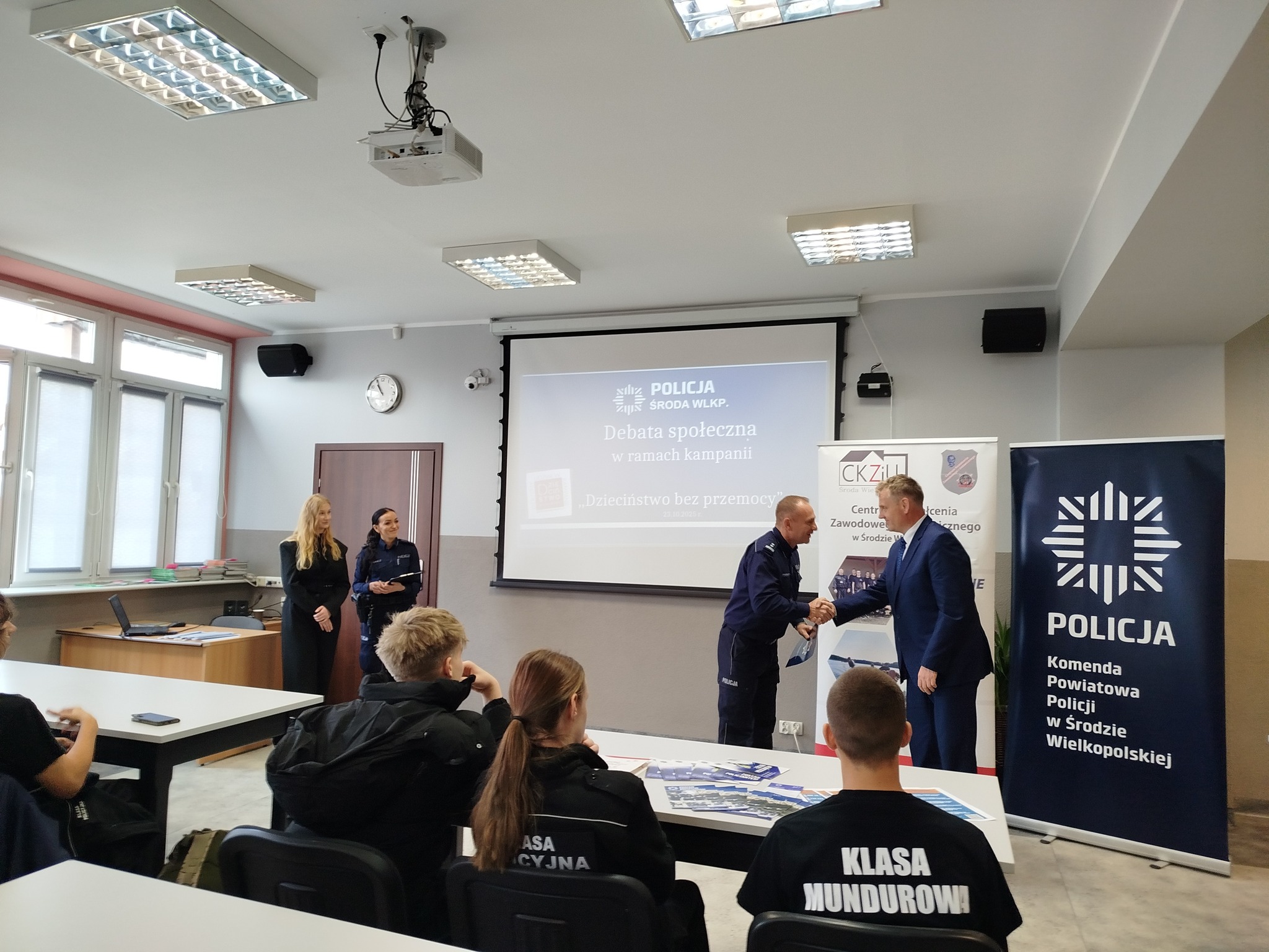 Organizatorem debaty była Komenda Powiatowa Policji w Środzie Wielkopolskiej. Spotkanie poprowadziła psycholog z Poradni Psychologiczno-Pedagogicznej p. Klaudia Bystrzak. Debatę rozpoczął zastępca Komendanta Powiatowego Policji w Środzie Wielkopolskiej mł. insp. Damian Biesiada, który z okazji Dnia Edukacji Narodowej przekazał na ręce dyrektora CKZiU p. Marka Kostki życzenia i podziękowania za dotychczasową współpracę
